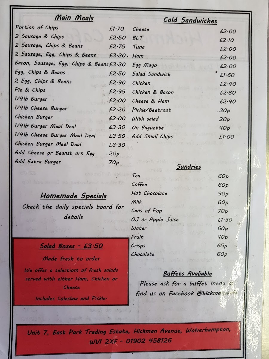 Welcome to Hickmans Cafe, an inviting spot nestled in the East Park Trading Estate, Wolverhampton. This charming cafe has quickly become a local favorite, known for its deliciously hearty offerings. Whether you're craving a hot sandwich or a satisfying all-day breakfast, Hickmans has something for everyone.